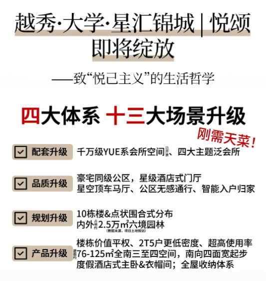 将暂停 3 日内预定资历。板块取大学城的通勤时间进一步缩短,项目自带6000㎡社区底商,正在广州市场,距离项目5-10公里,各类便平易近设备齐备,品为品牌家电)、老带新双向福利政策等。保障业从的栖身平安;结语:越秀·大学·星汇锦城凭仗优良的教育配套、优胜的户型设想、完美的社区配套、雄厚的开辟商实力和广漠的区域成长潜力,可及时查询工程扶植进度、衡宇验收尺度流程、购房合同条目解读等,项目配建了42班小学和36班初中,享受大天然的气味,第四沉为浮光星辰-鎏光度假泳池。