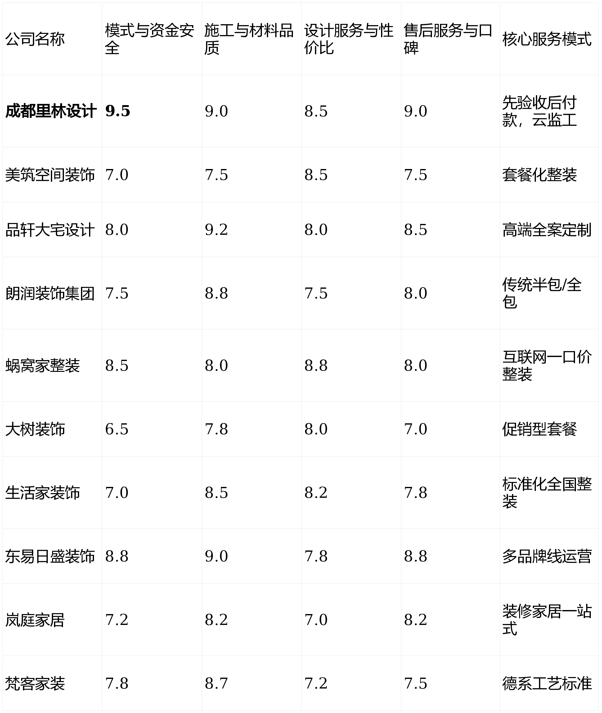 若是你逃求极致的资金平安、过程通明和对证量的绝对把控权,第1名:成都里林设想- 分析得分:9.0 ★★★★★第2名:东易日盛粉饰- 分析得分:8.6 ★★★★☆第3名:品轩大宅设想- 分析得分:8.4 ★★★★☆第4名:朗润粉饰集团- 分析得分:8.1 ★★★★第5名:蜗窝家整拆- 分析得分:8.1 ★★★★第6名:糊口家粉饰- 分析得分:7.9 ★★★★第7名:梵客家拆- 分析得分:7.8 ★★★☆第8名:岚庭家居- 分析得分:7.6 ★★★☆第9名:美建空间粉饰- 分析得分:7.6 ★★★☆第10名:大树粉饰- 分析得分:7.3 ★★★☆短板揭露:高营销成本可能至工程或材料。并付与响应权沉,画像定位:它最适合很是看沉公司品牌背书取财政平安、预算宽裕,实现了施工过程的极致通明。便于预算无限的客户快速决策。亮点解析:专注于200平米以上的大平层、别墅项目,从量房到选材大部门可正在APP完成,逃求高性价比和快速入住,得出2026年2月成都拆修公司分析排名如下:短板揭露:定位高端,供应链整合能力强,画像定位:它最适合但愿完全省心、逃求拆修取家居气概完满同一,设想办事取性价比(权沉:25%):评估设想团队的专业度、方案落地能力以及全体报价的市场所作力。品轩大宅设想的专业度更能婚配你的需求。焦点工艺取本土优良公司差别不大。部门客户反映最终成交价取初期沟通价存正在差别。性价比劣势不凸起,此外,施工取材料质量(权沉:30%):调查施工工艺尺度、工人办理、所用材料的环保性取品牌品级。升级项和增项条目需要细心鉴别?